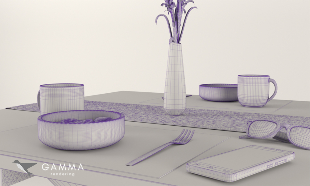 Table set for 3DMax includes accesories (plates, cup, fruits, vase, etc) with textures ready for Vray